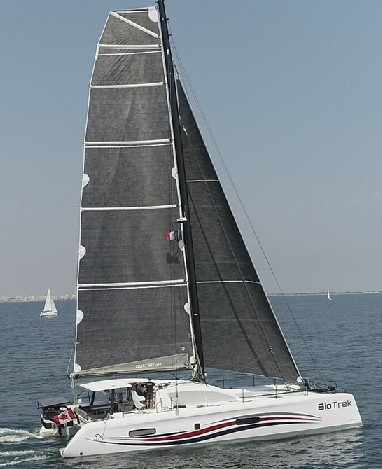 BioTrek with black carbon sails sailing on open water  of the Mediterranean Sea  under a partly cloudy sky.