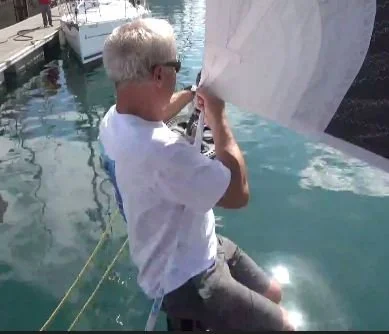 Pierre sitting on the bowsprit of a catamaran over the water repairing a head sail. The  boat is docked at a marina.