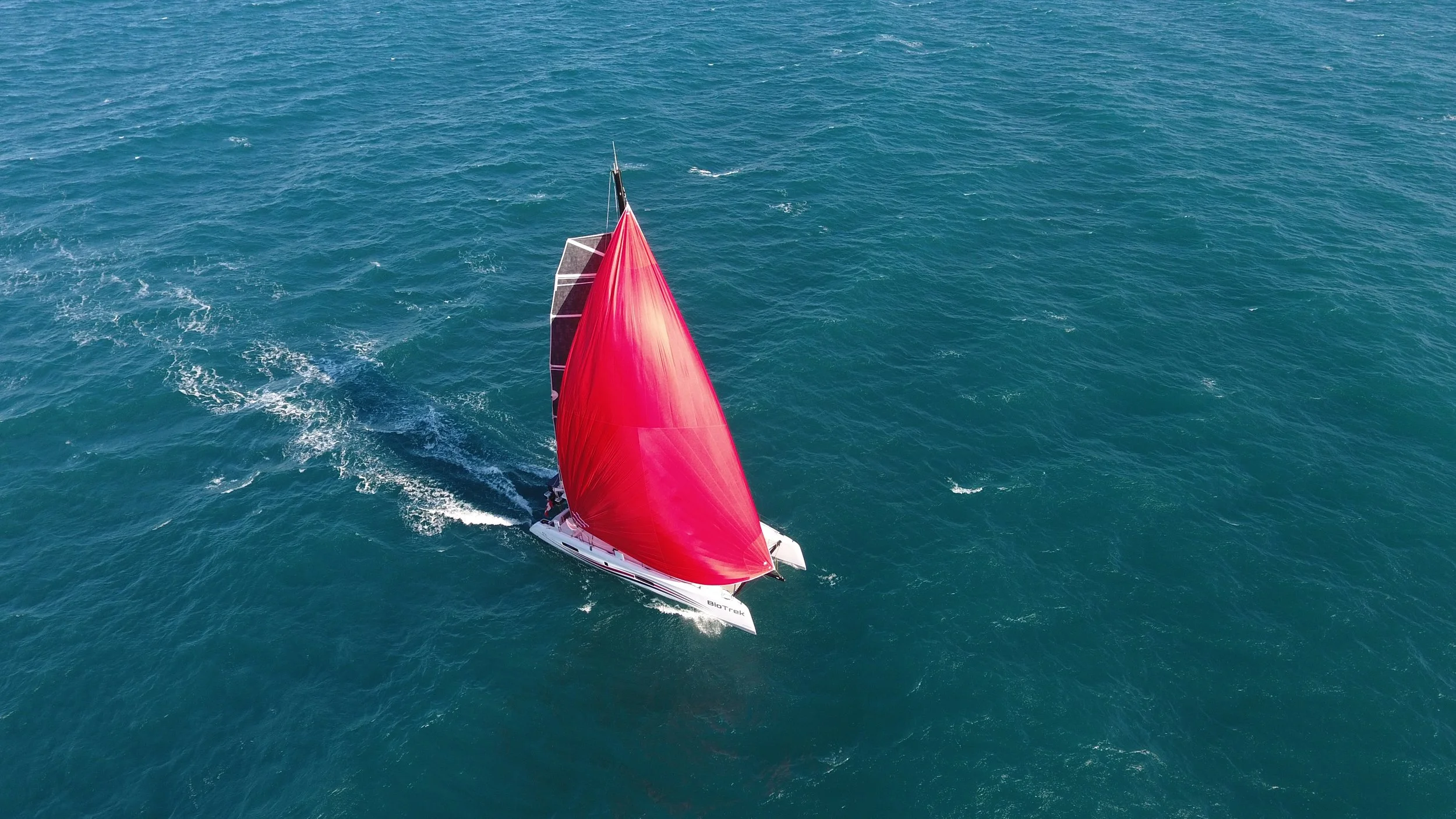 A performance catamaran with a bright red spinnaker sailing on the ocean during daytime.